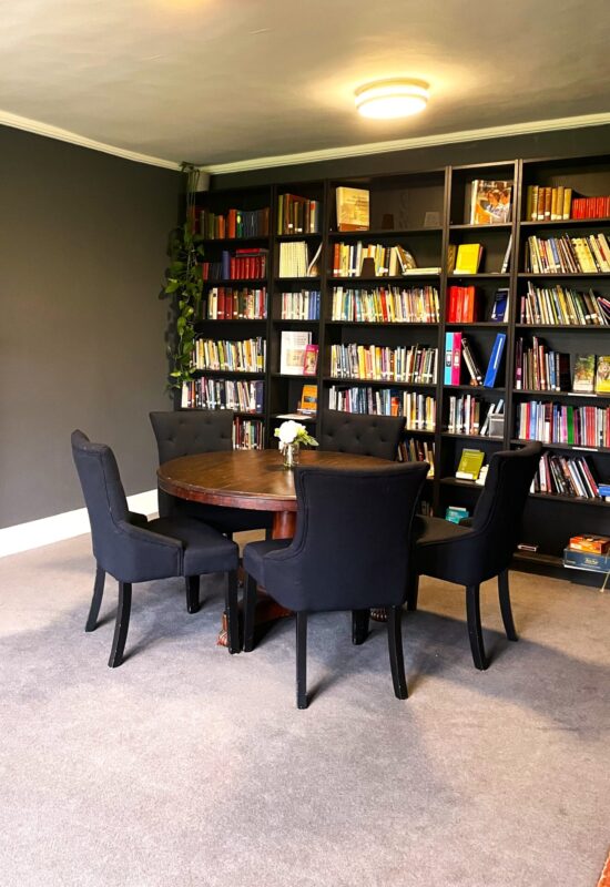 The Library, located on the ground floor of the Manor opposite the sitting room, is a traditional space filled with a diverse range of books and offering a stunning view over the gardens. It’s the perfect setting for rest, relaxation, and contemplation.